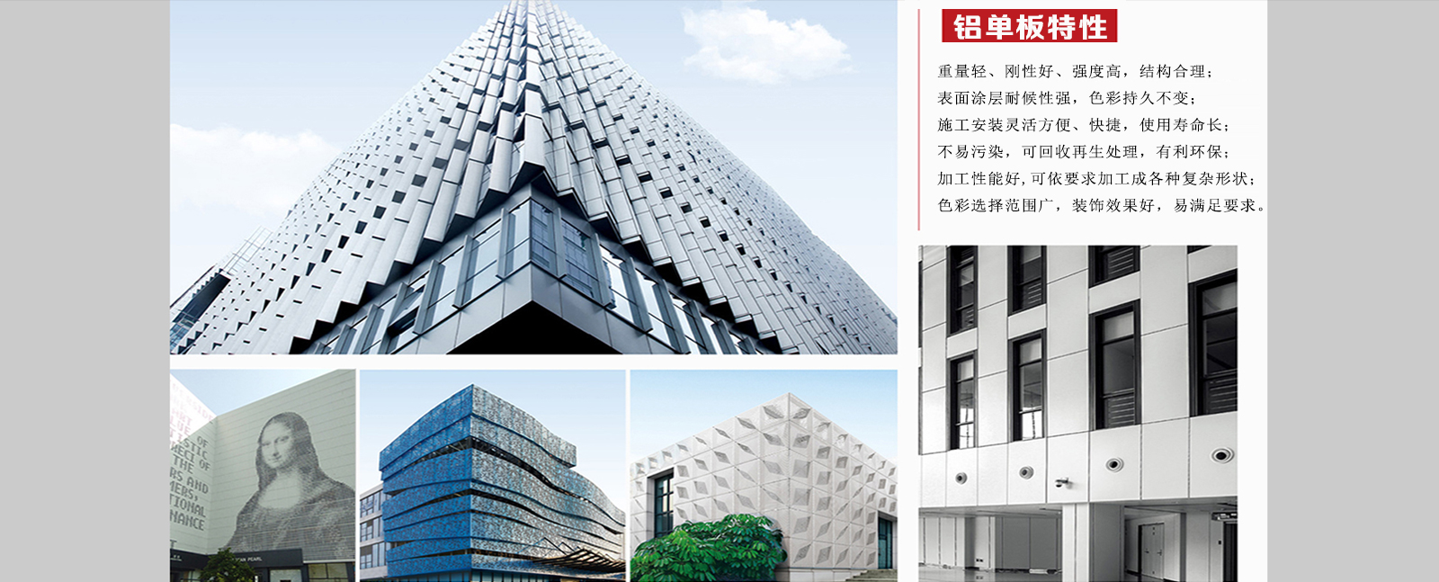 鋁單板幕墻產(chǎn)品具有強度高、重量輕、耐腐性強、結(jié)構(gòu)新穎、裝配方便、經(jīng)久耐用的特點。氟碳鋁單板能抗酸雨、鹽霧和各種空氣污染物,耐冷熱性能好,能抵御強烈紫外線的照射,能長期保持不褪色、不粉化,使用壽命長。但是再好的東西不去愛護(hù)它、保養(yǎng)它,更何…